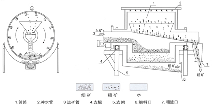 料漿分級篩首要由篩網、提渣板、沖刷水管、收渣斗、進漿排渣管、接礦斗和傳動機構構成。任務時,拆卸篩網的圓筒在傳動機構的驅動下扭轉,礦漿從進漿排渣管的左下部給入到篩網的圓周上。細粒礦物和水穿過篩網落入到接礦斗,沿管道自流至下一道工藝。粗粒局部被提渣板提至頂部被沖刷水突入收渣斗排走。